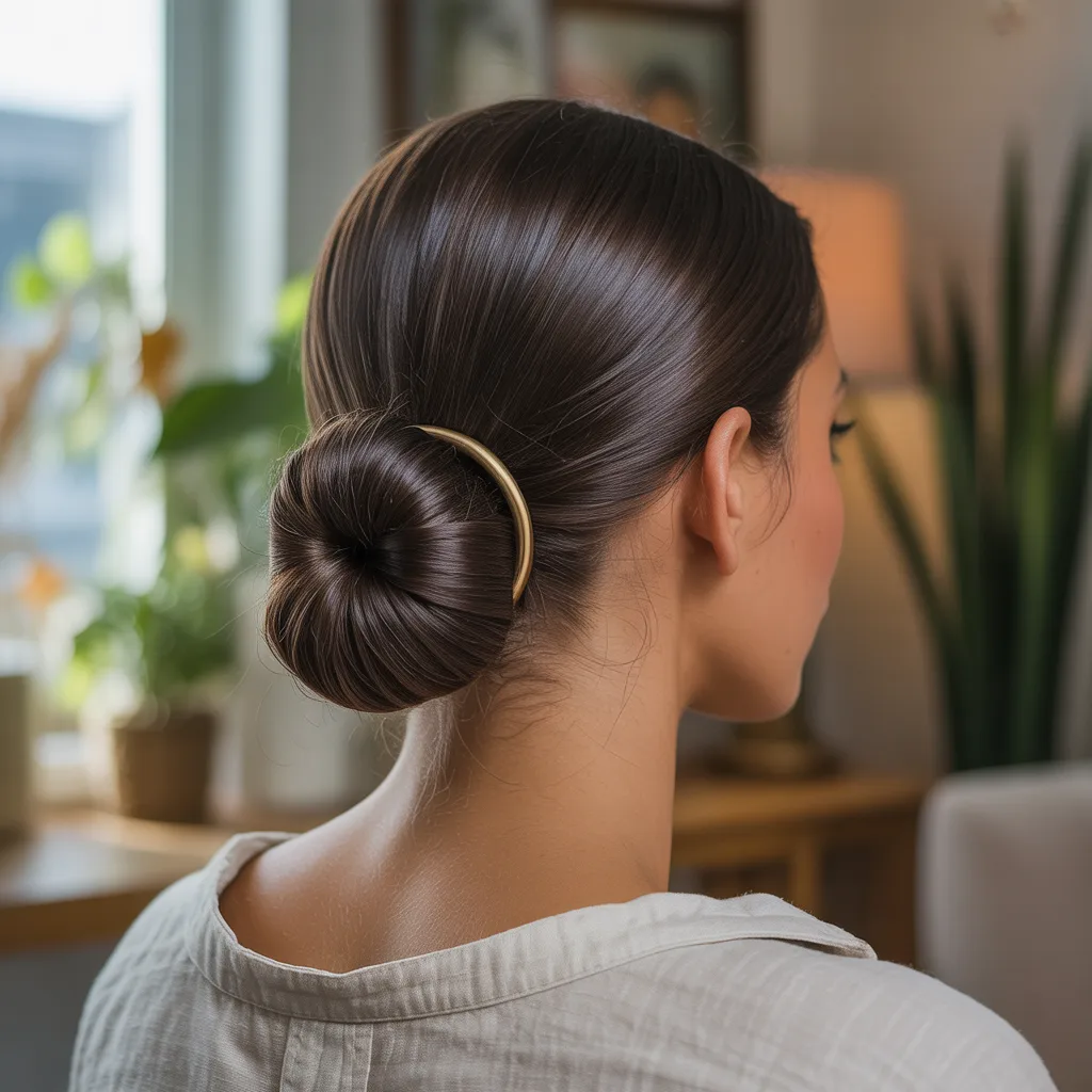 A sleek low bun sits neatly at the nape of the neck. The center part adds a clean, modern feel to the style. It was found that a little smoothing gel keeps it flat longer. This look suits both professional settings and relaxed everyday wear.