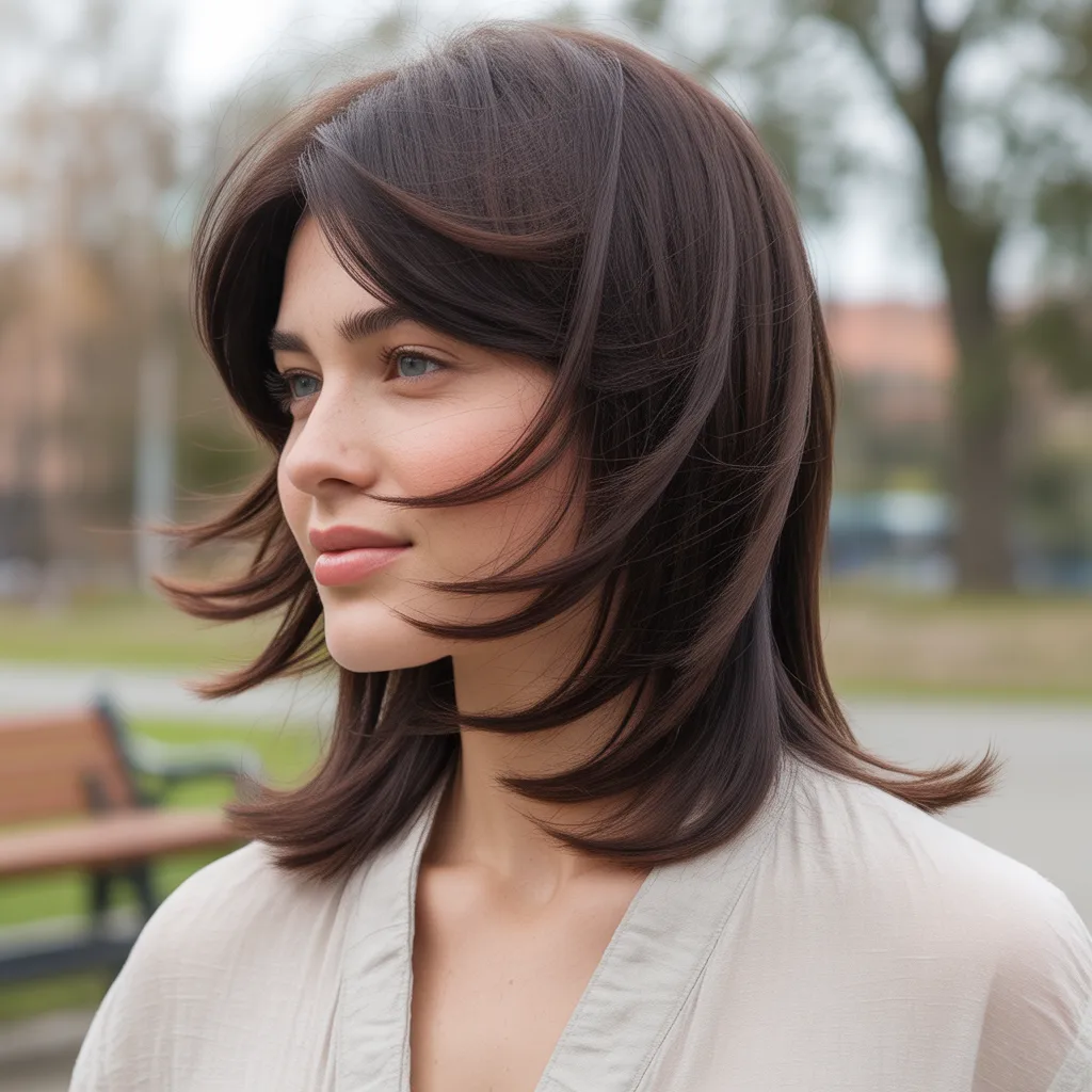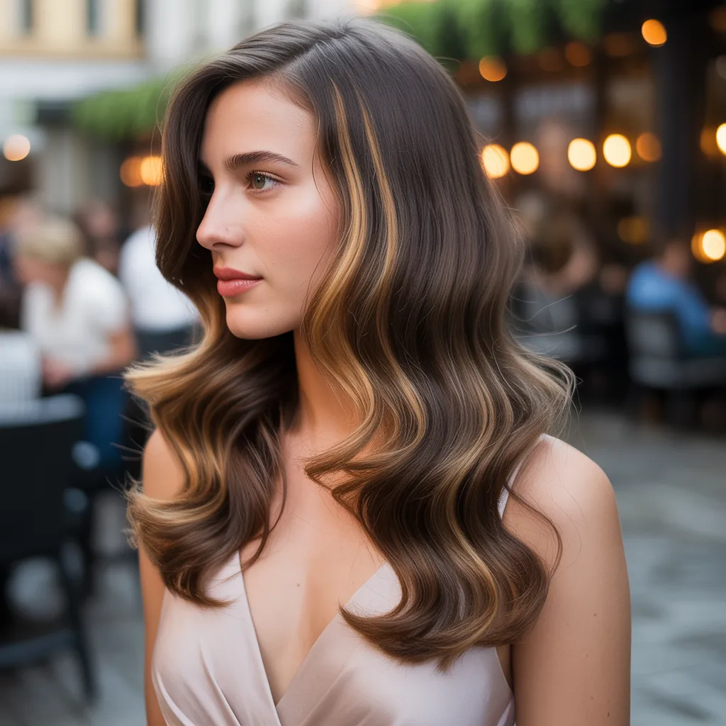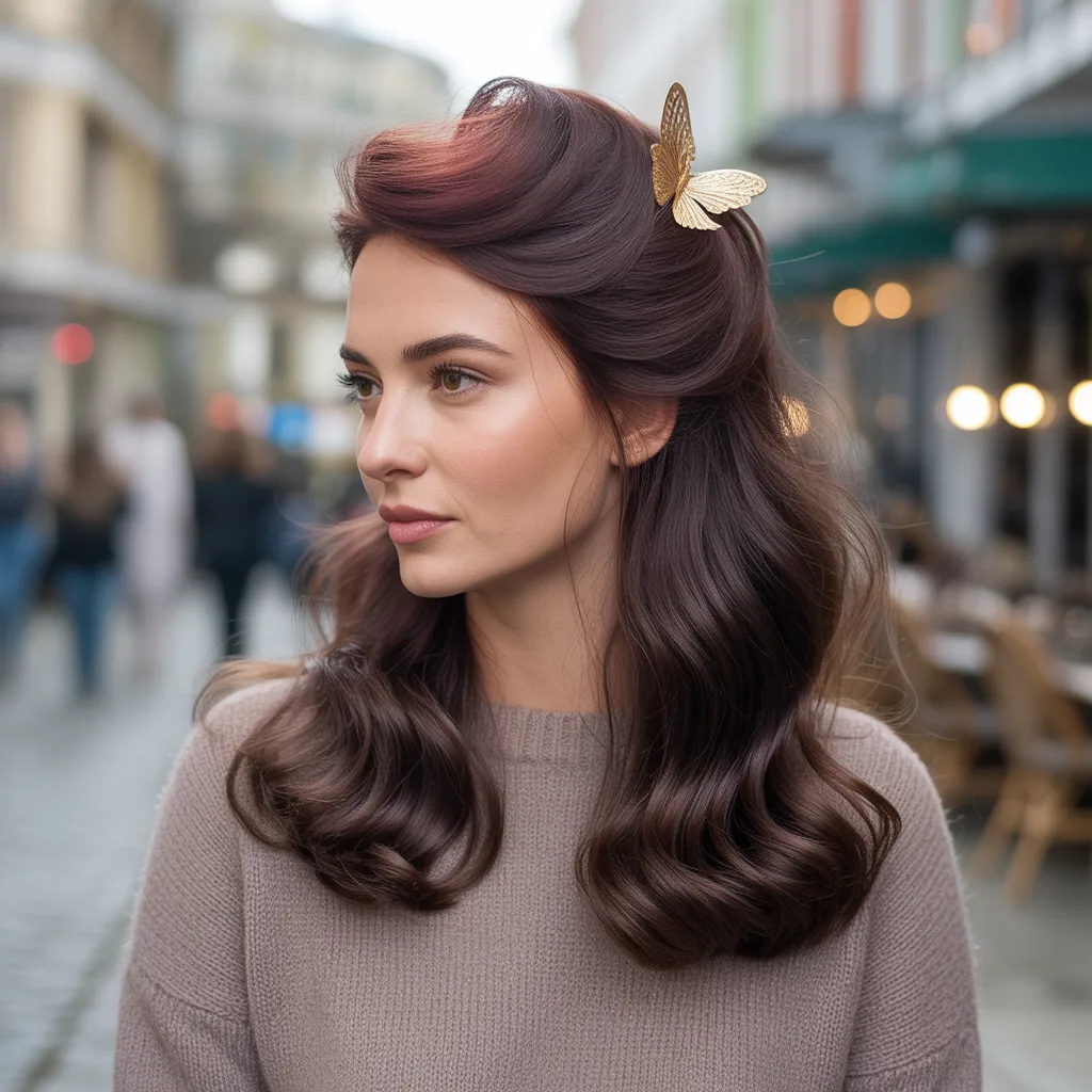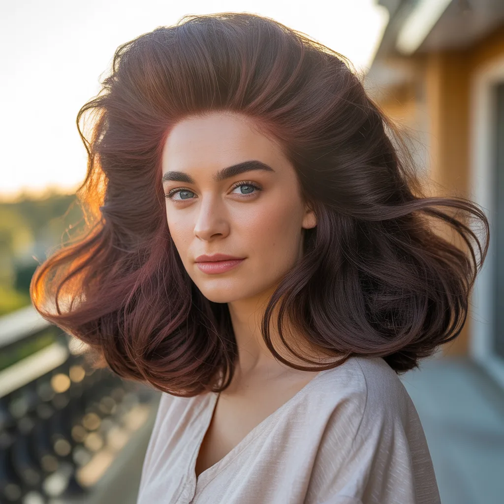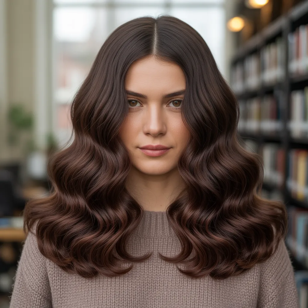 Woman with voluminous deep espresso hair showcasing a glamorous mob wife hairstyle with soft waves and rich color