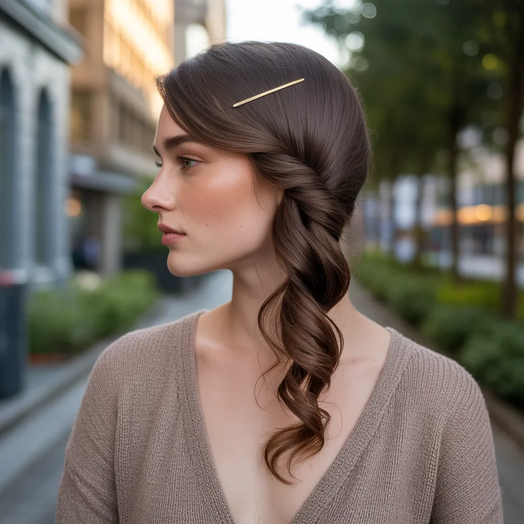 This style works beautifully on medium to long hair lengths. A pearl pin or jeweled clip adds a nice and elegant finishing detail.