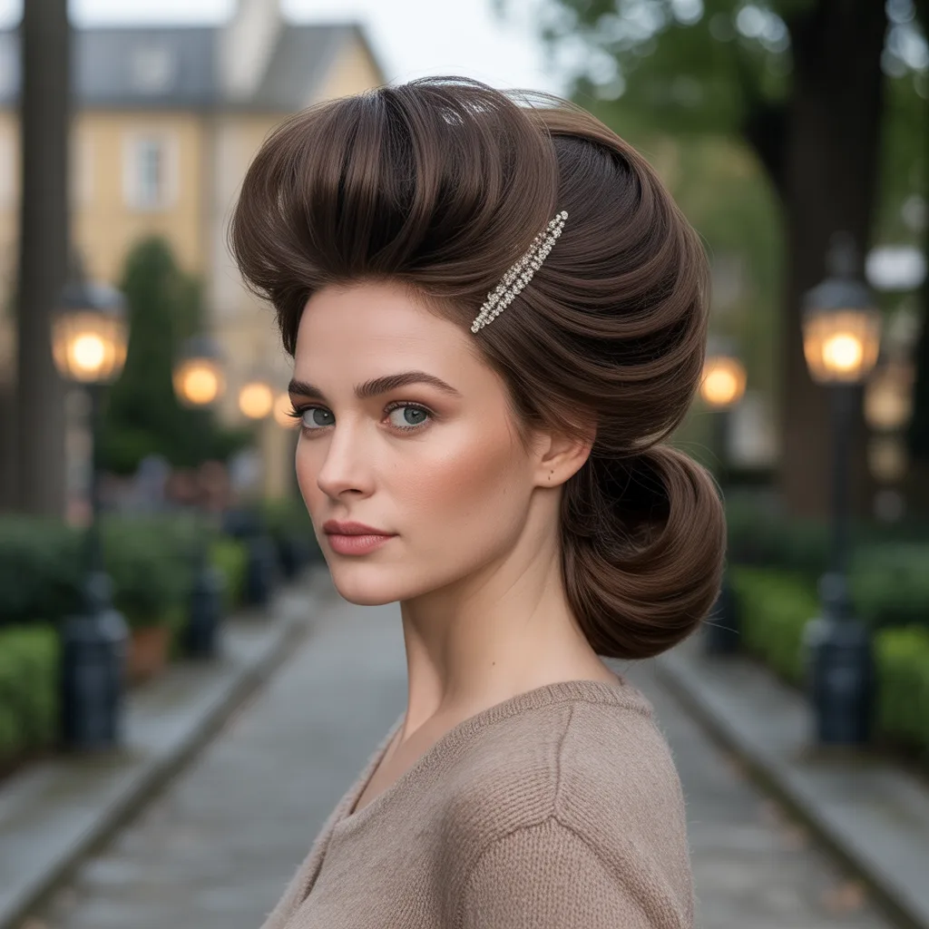 An elegant bouffant adds volume and height for a dramatic formal look. It has a vintage-inspired feel that works well with formal ball gowns.