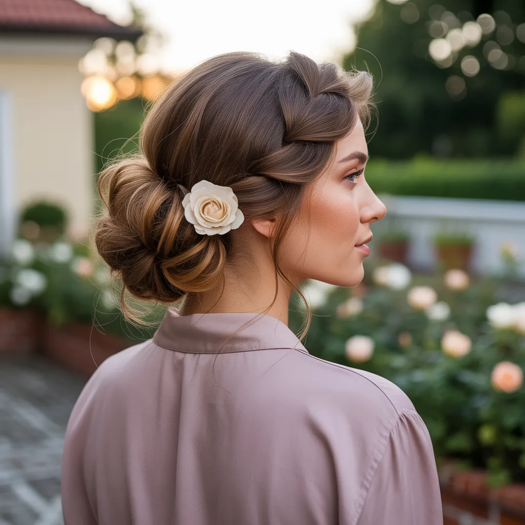 A floral accent updo brings a romantic and fresh detail to a formal night. Small flowers are tucked neatly into a bun or braid for a gentle effect.