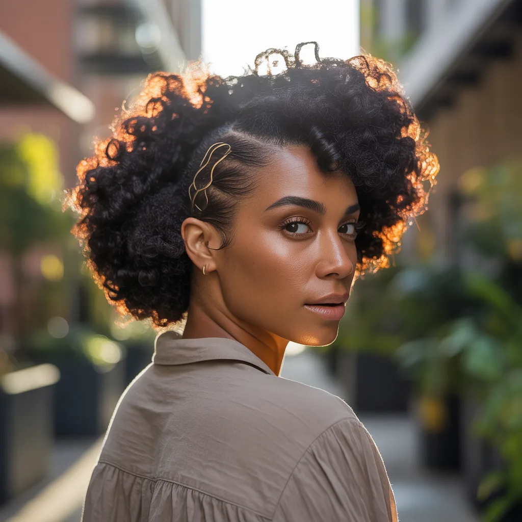 Defined coils or curls are gently gathered and pinned neatly at the back. During regular use, a light moisturizing product keeps the texture looking fresh.