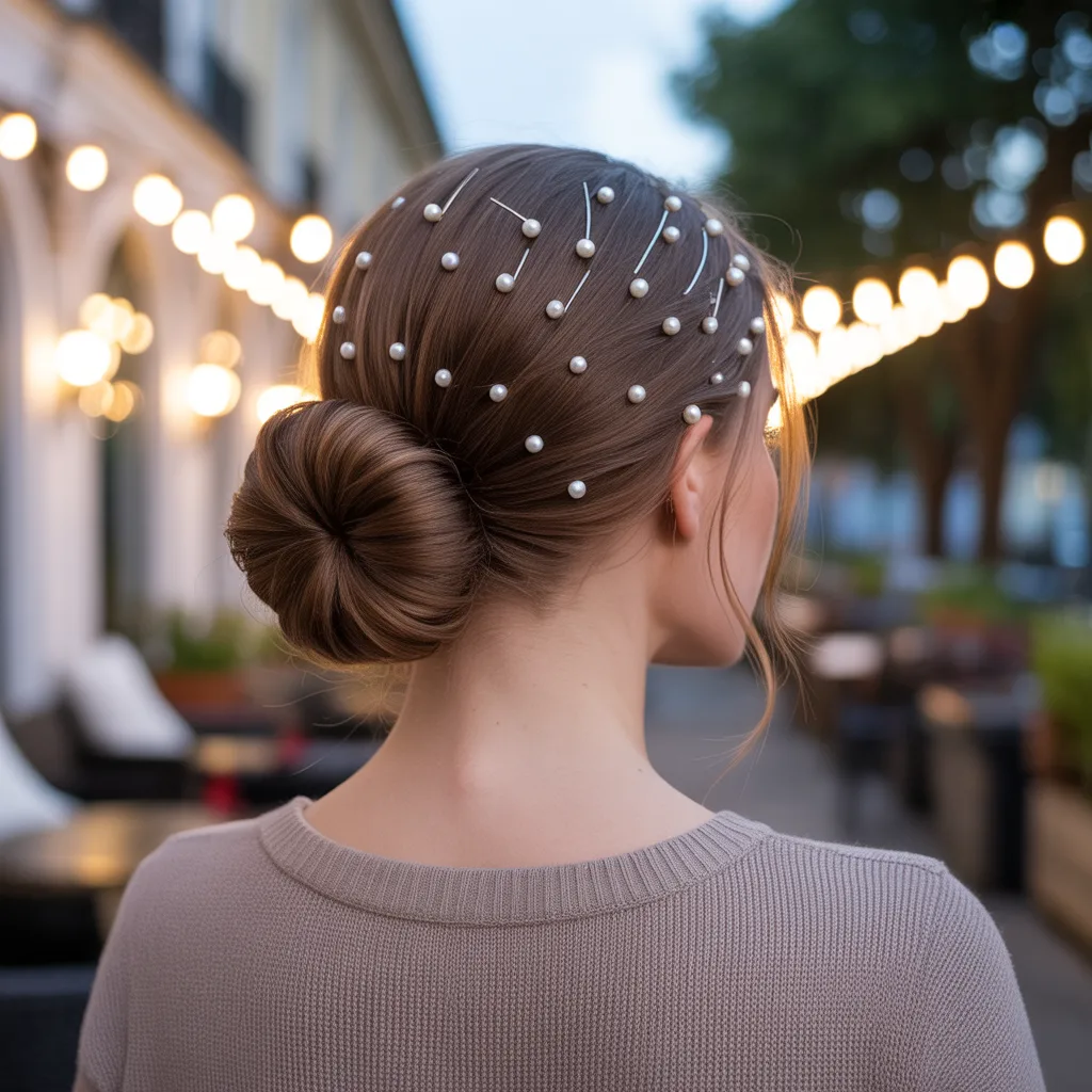 A pearl pin bun is a delicate and timeless formal style for prom night. Small pearl pins are scattered throughout the bun to add a soft shine.