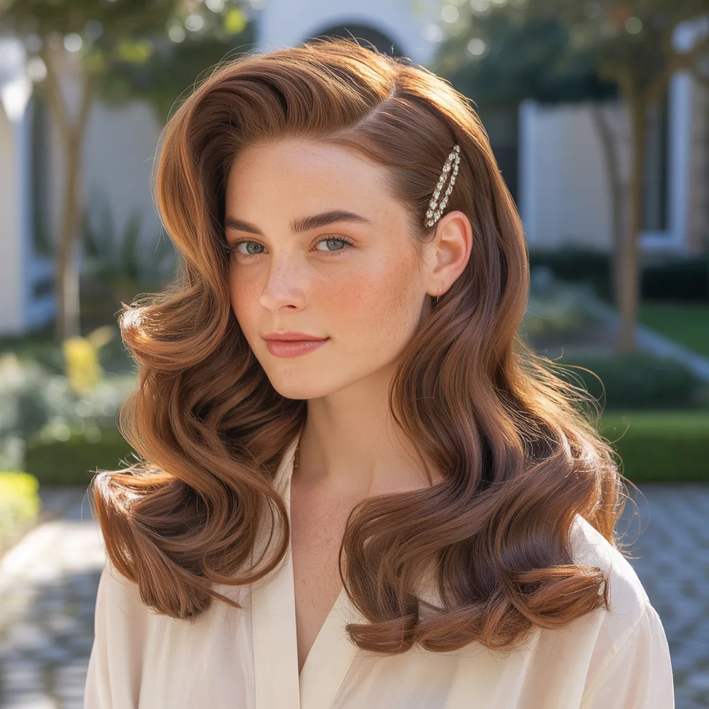 Pinned back waves are a soft and graceful option among popular prom hairstyles. One side is pinned back while the rest of the waves fall loosely.