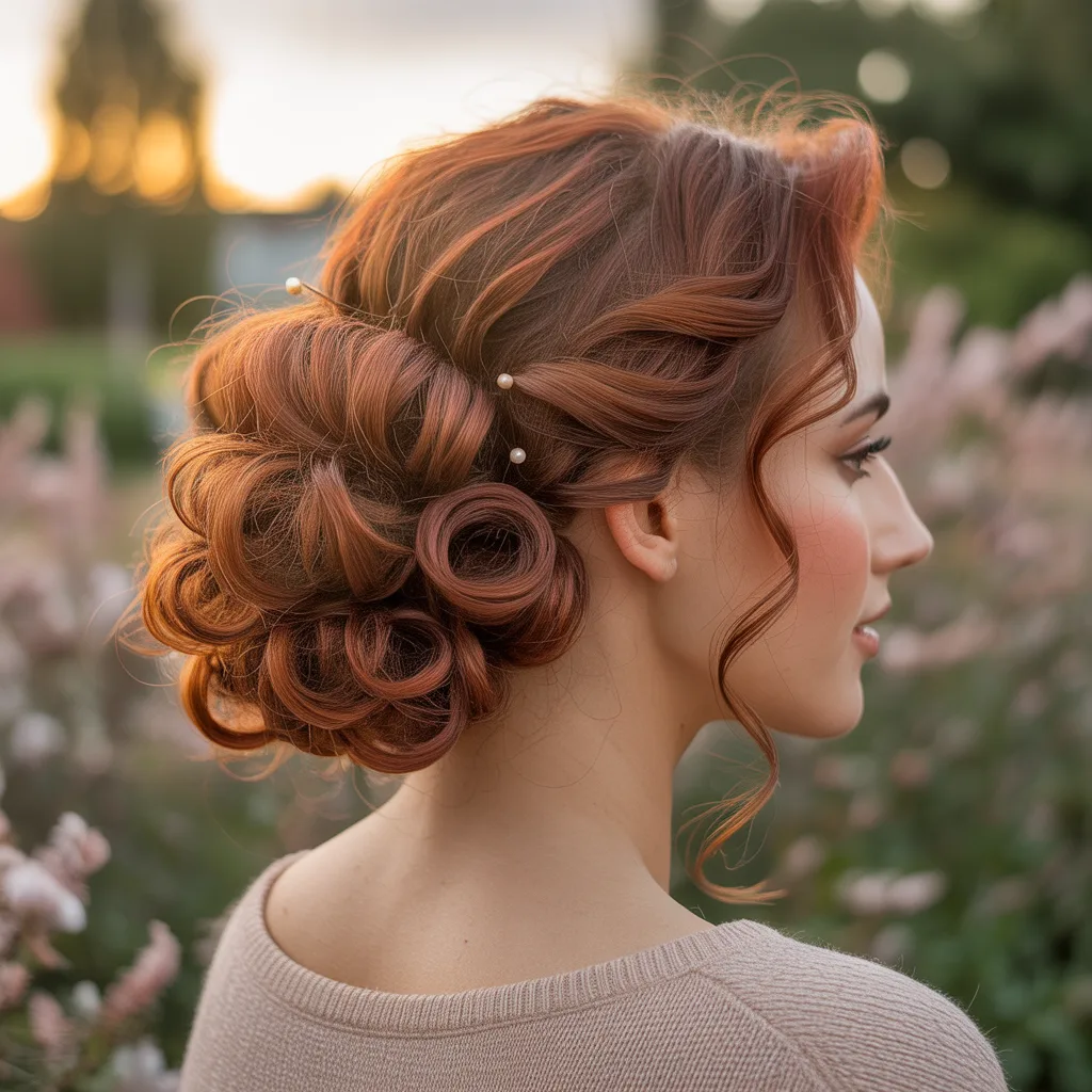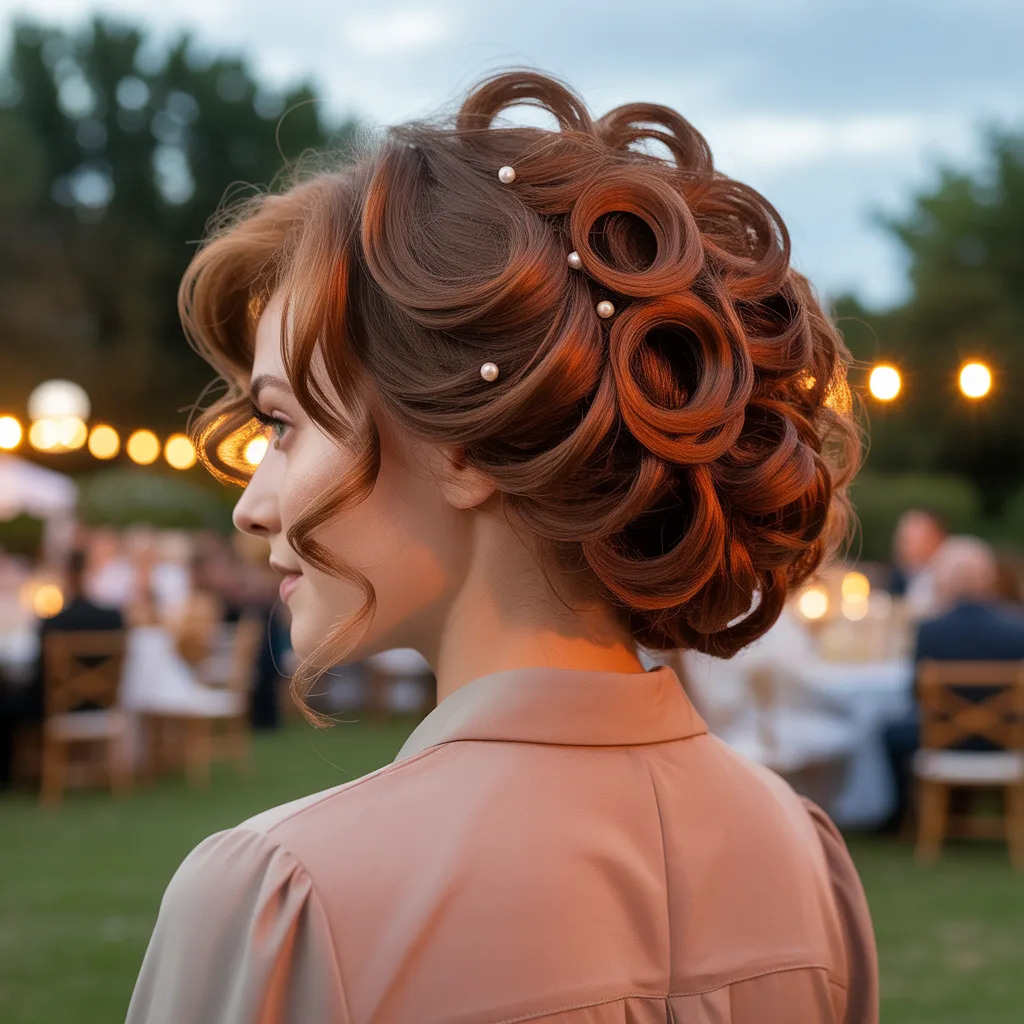A romantic updo with curls adds softness to any formal look. Loose pieces framing the face create a natural and flowing finish.