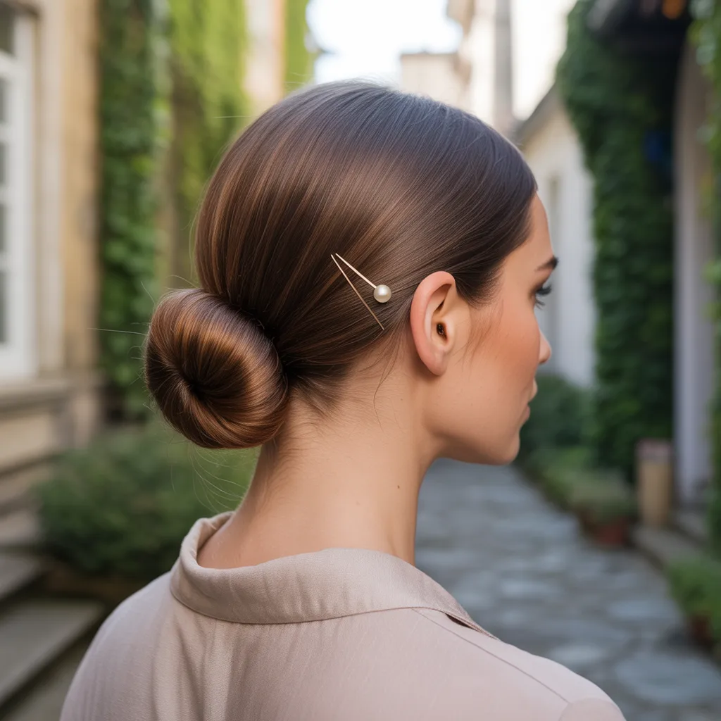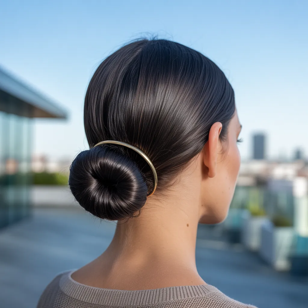 A sleek middle-part bun is a modern and editorial-inspired formal style. The clean center part gives the look a sharp and intentional finish.