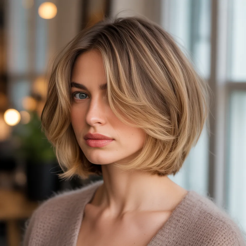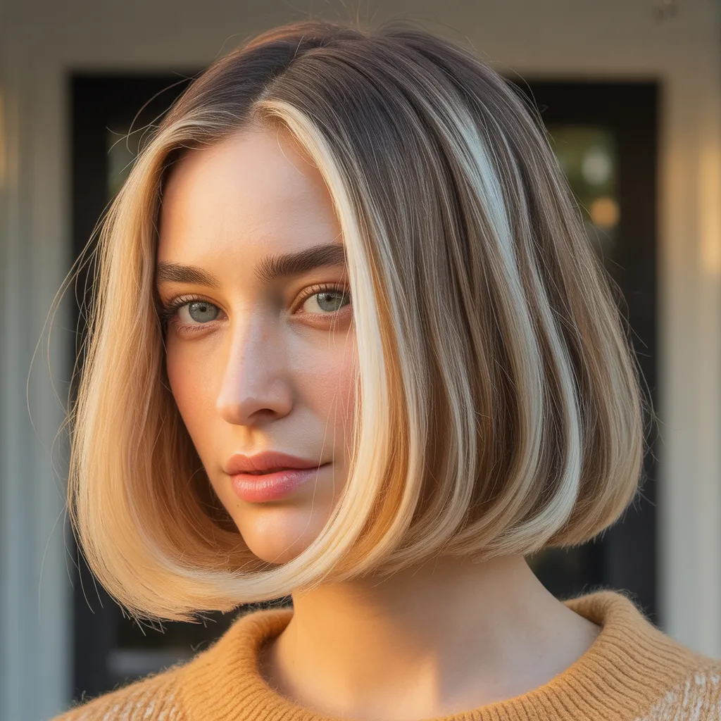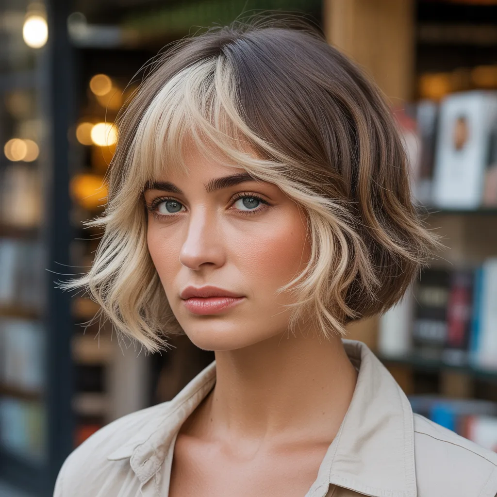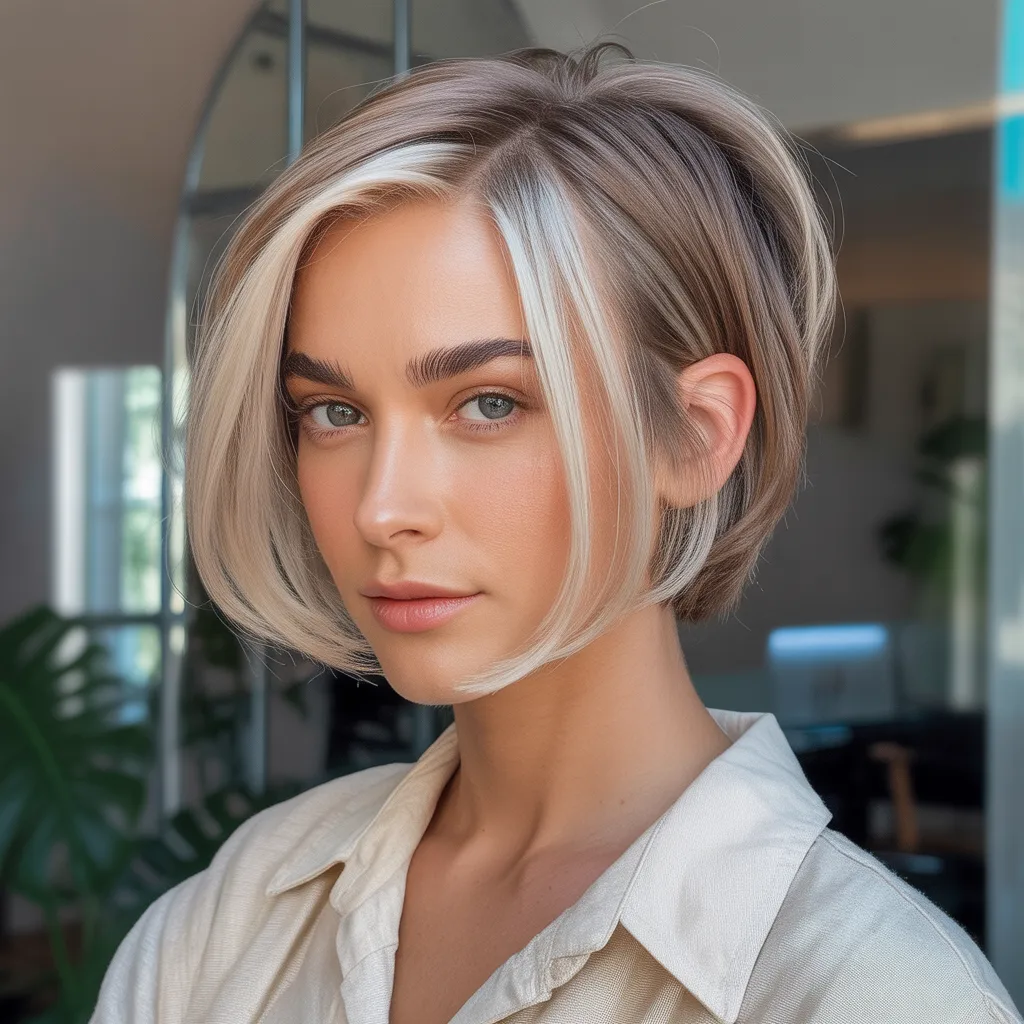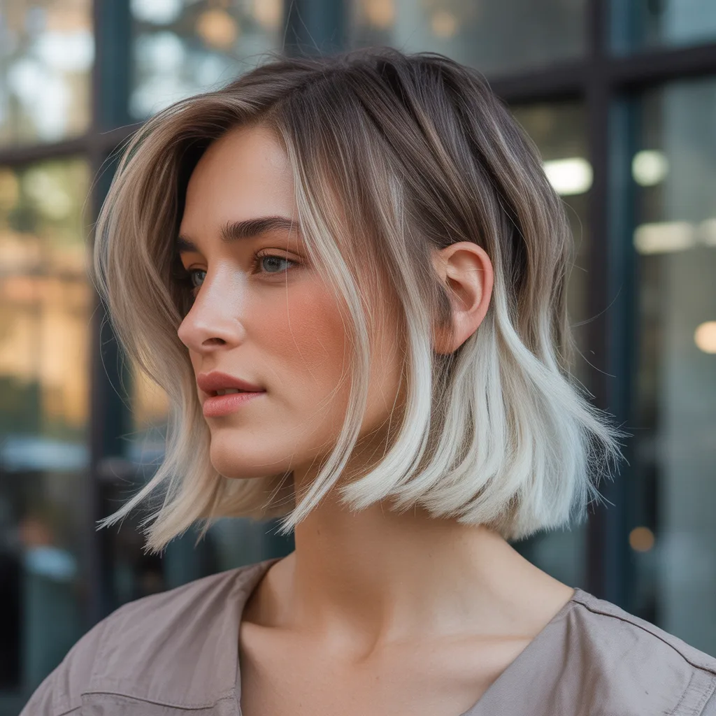 A woman with a sharp razor cut bob hairstyle in ash blonde color styled with textured ends and soft movement.