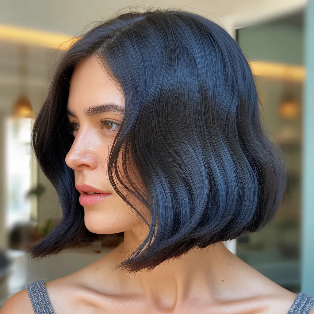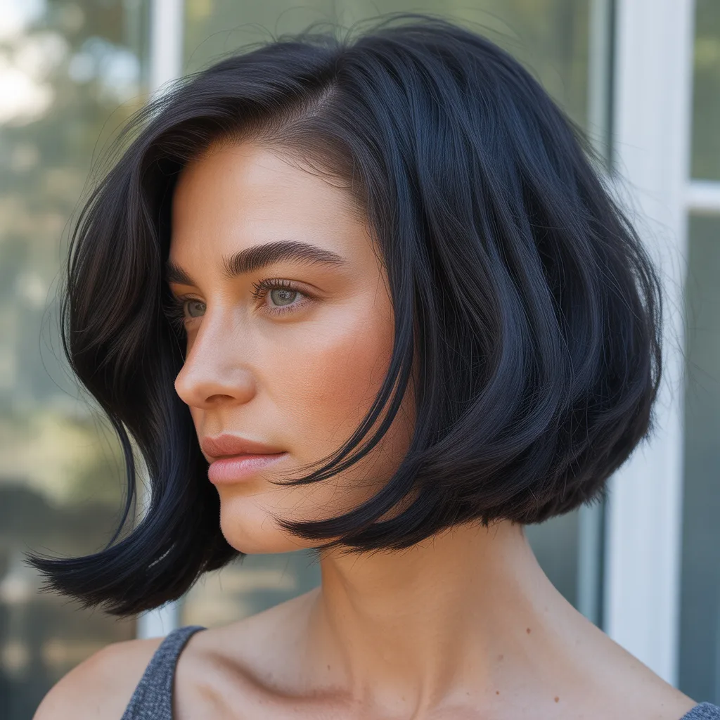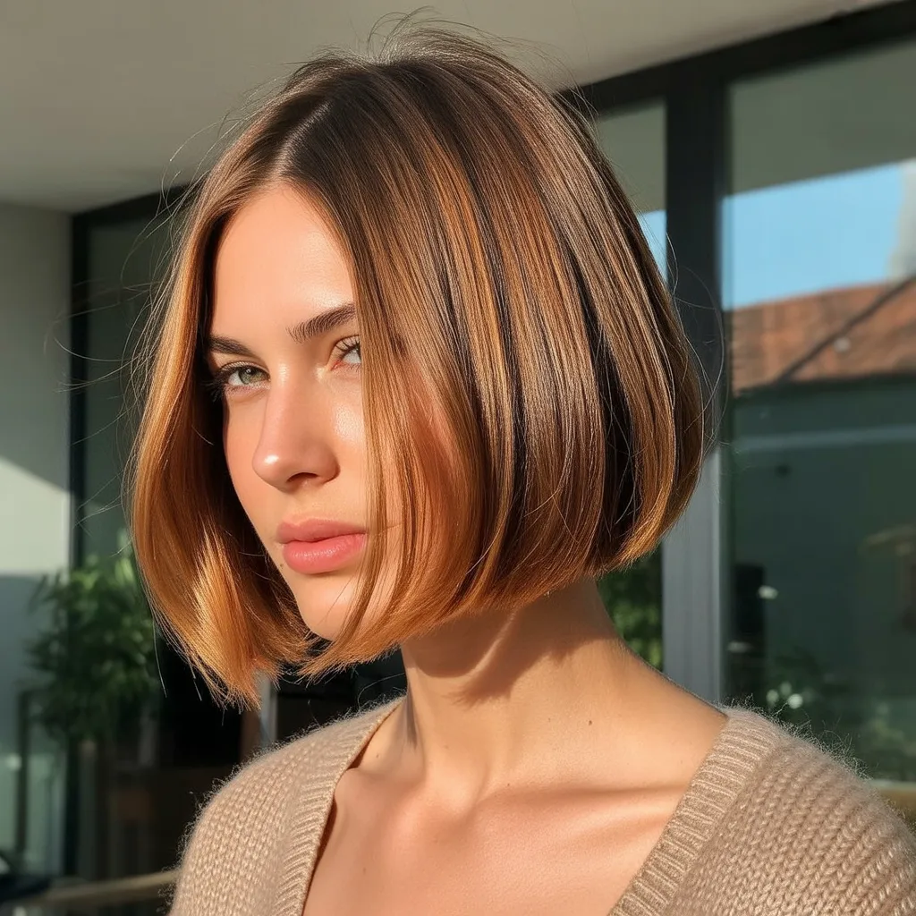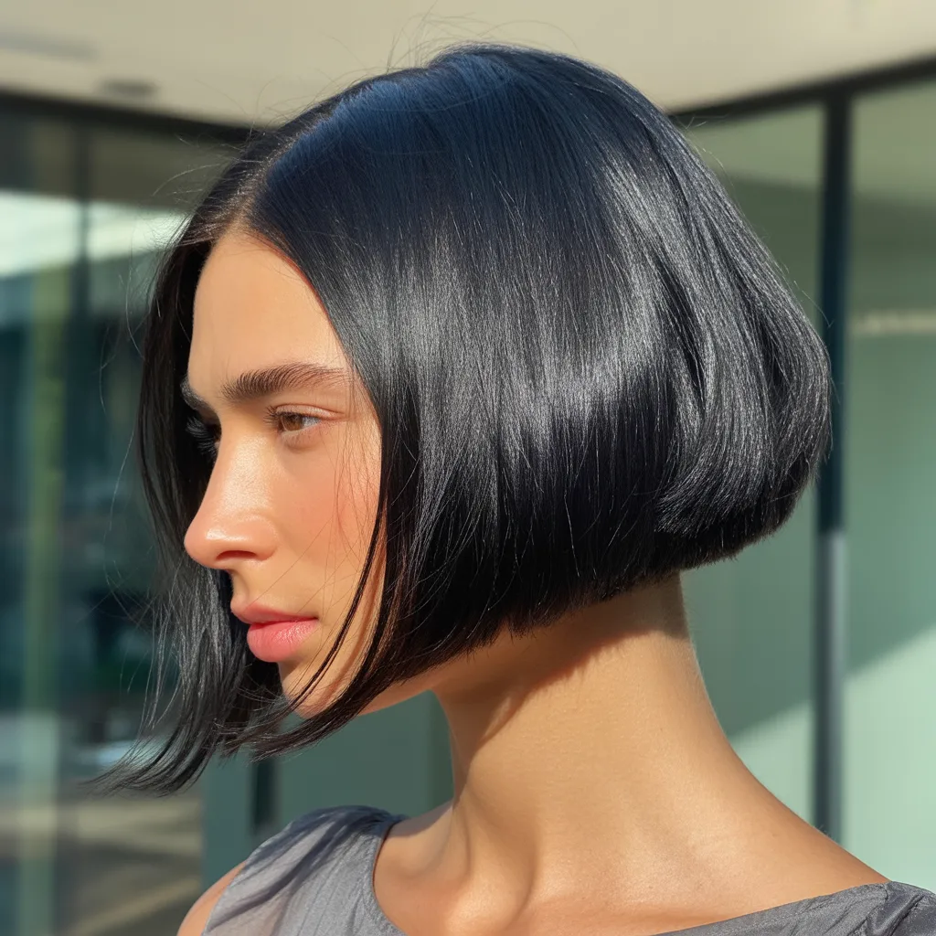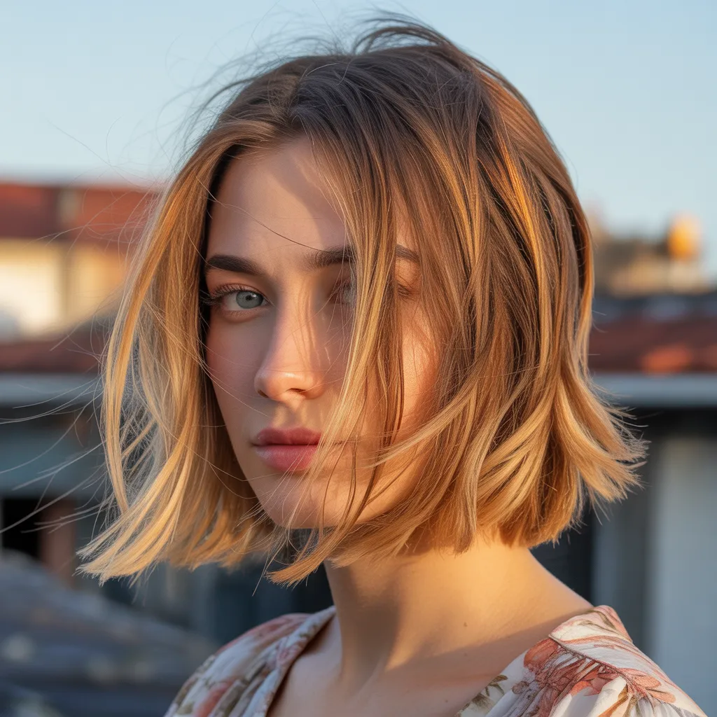 A woman with a sharp razor cut bob hairstyle in ash blonde color styled with textured ends and soft movement.