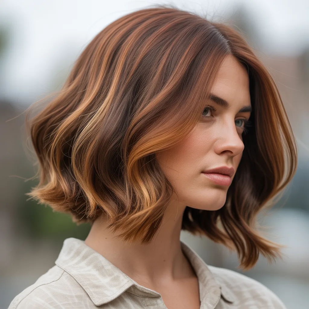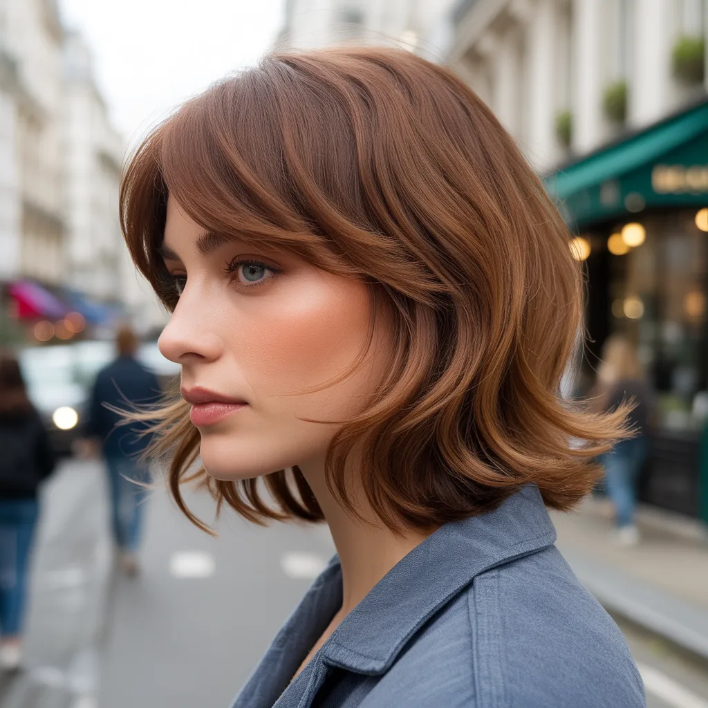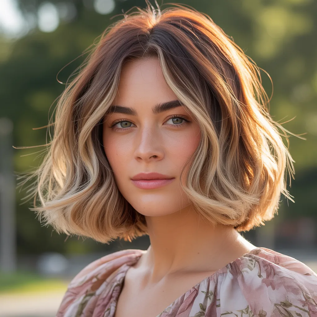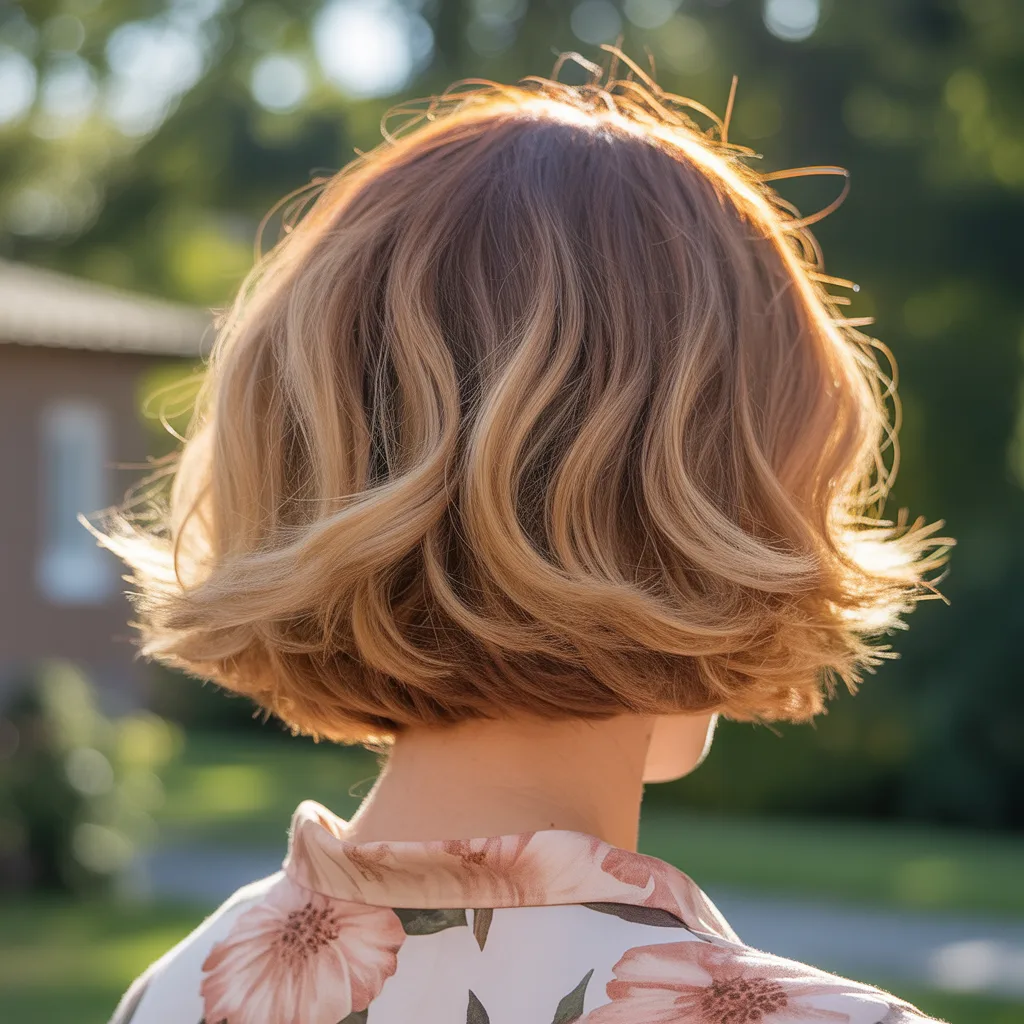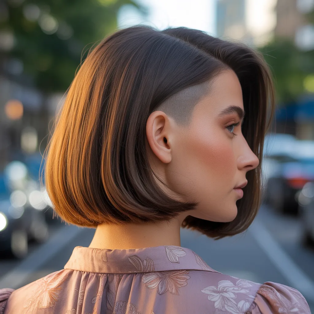 A woman with a sharp razor cut bob hairstyle in ash blonde color styled with textured ends and soft movement.