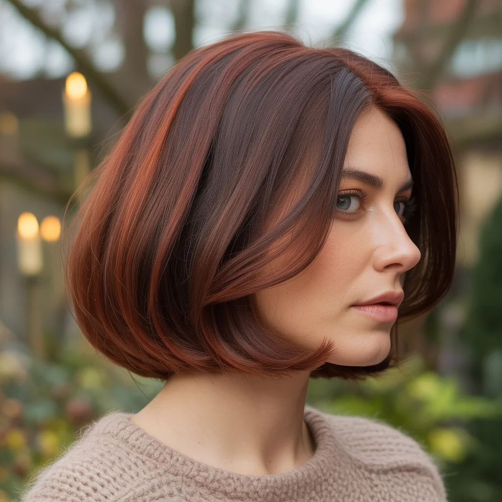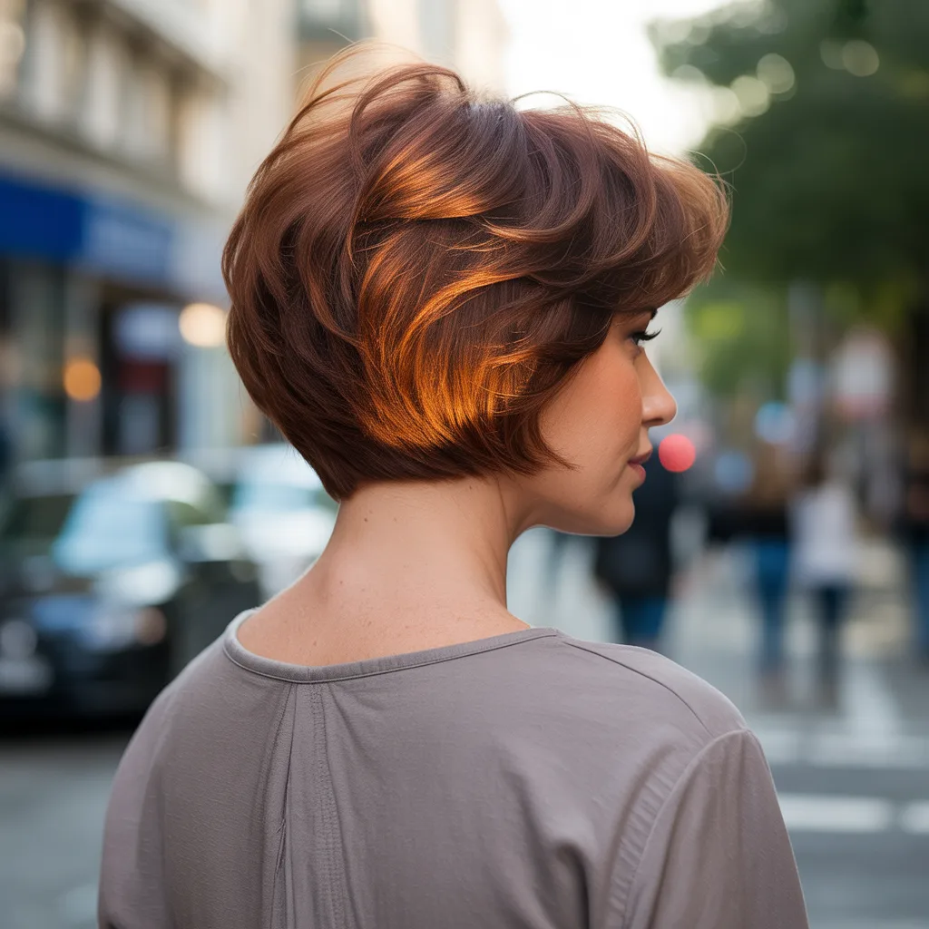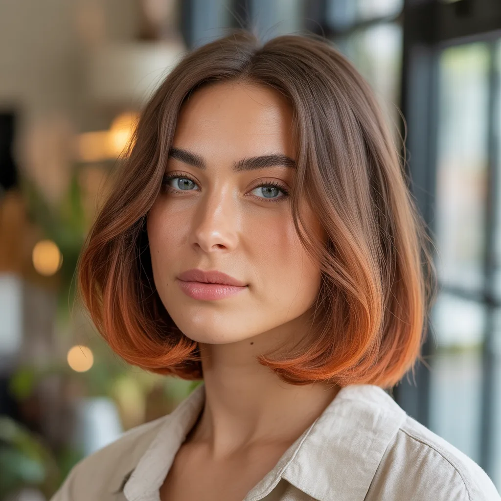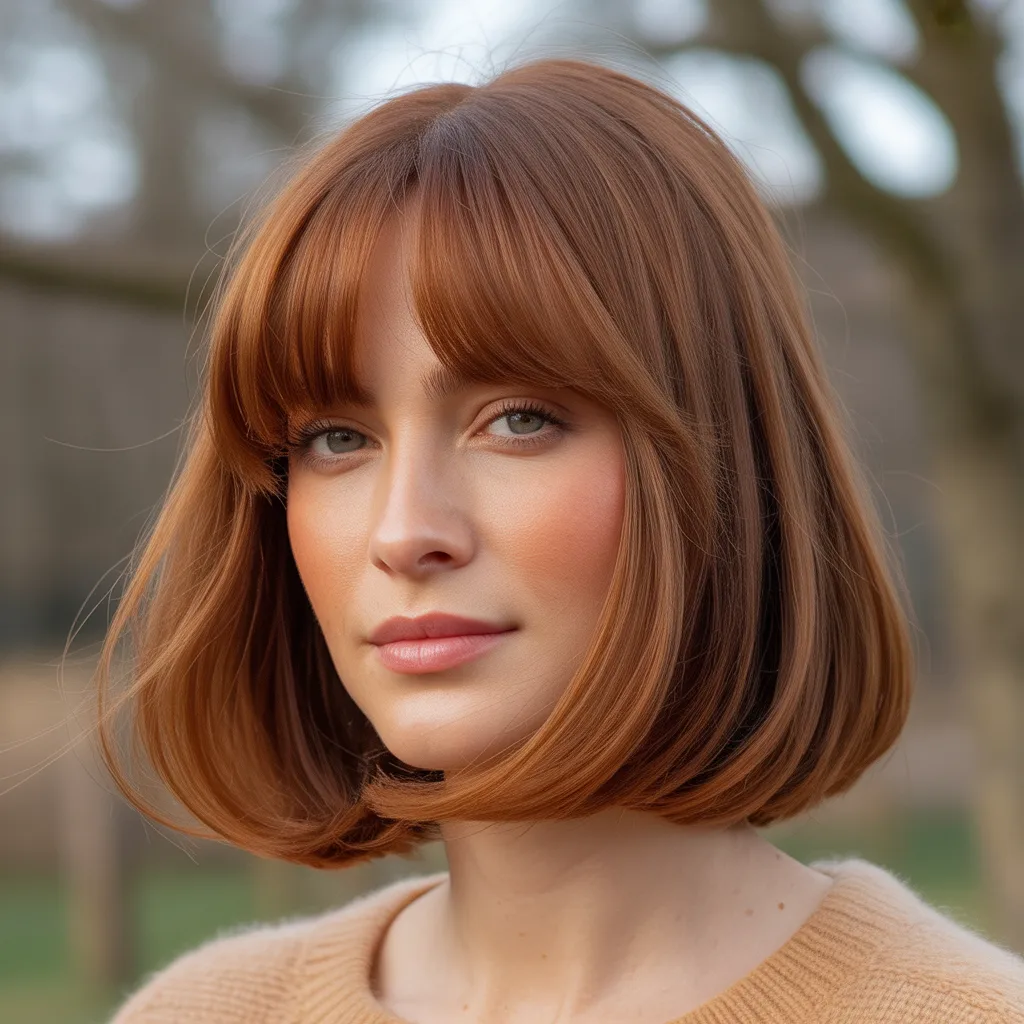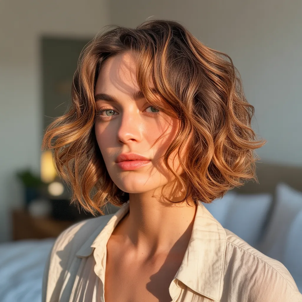 A woman with a sharp razor cut bob hairstyle in ash blonde color styled with textured ends and soft movement.