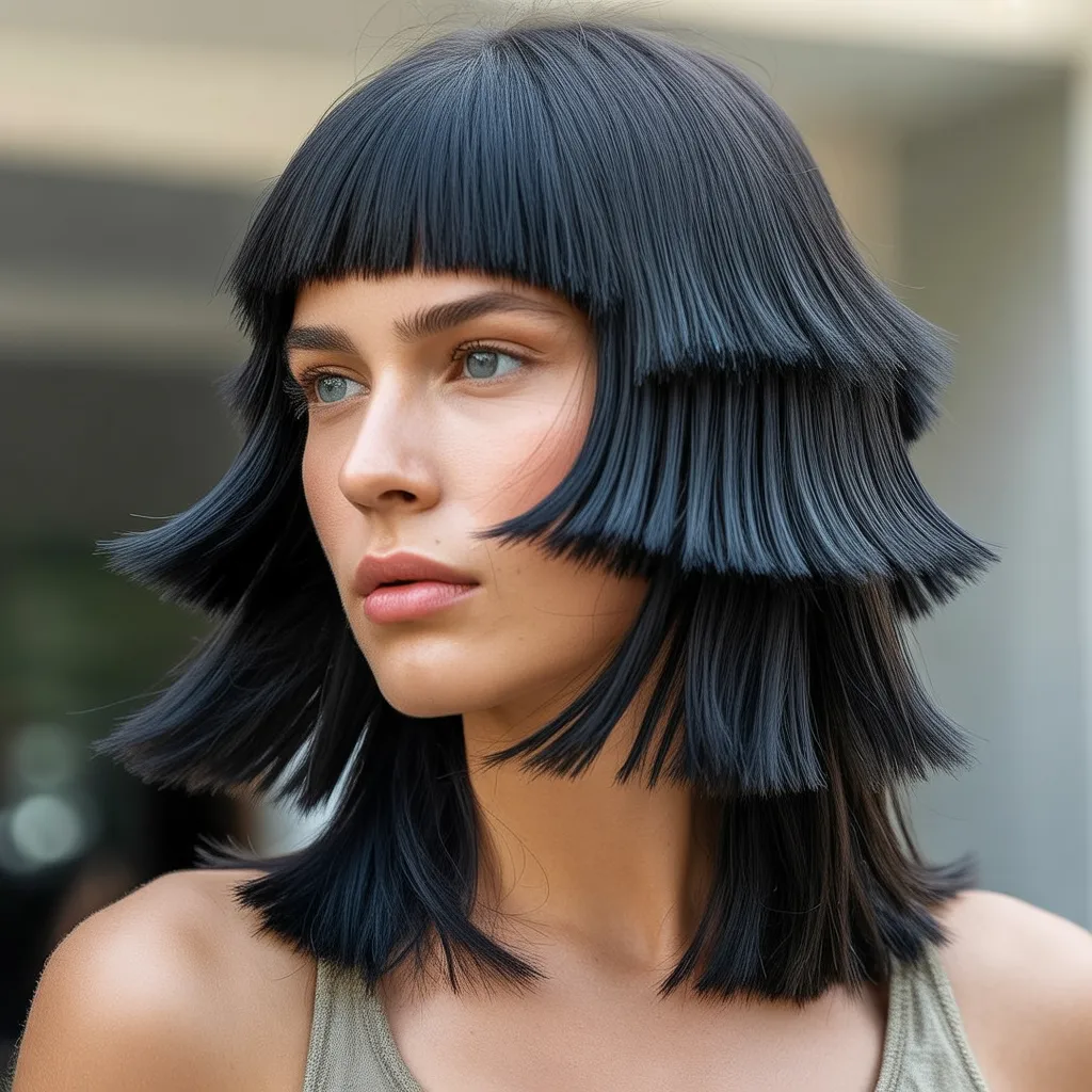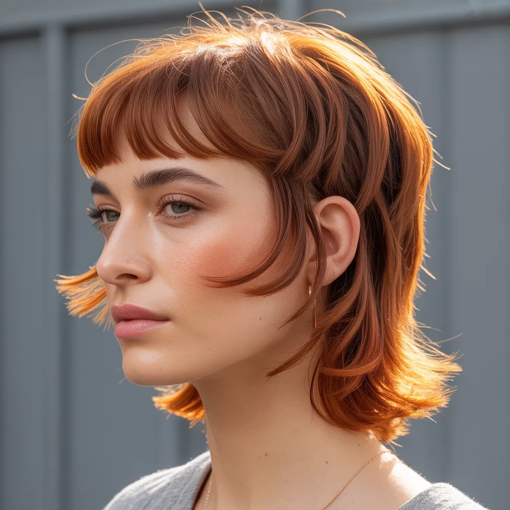 This is a shorter, modern take on the mullet shape with shag layers. Micro bangs complete the bold and fashion-forward style.