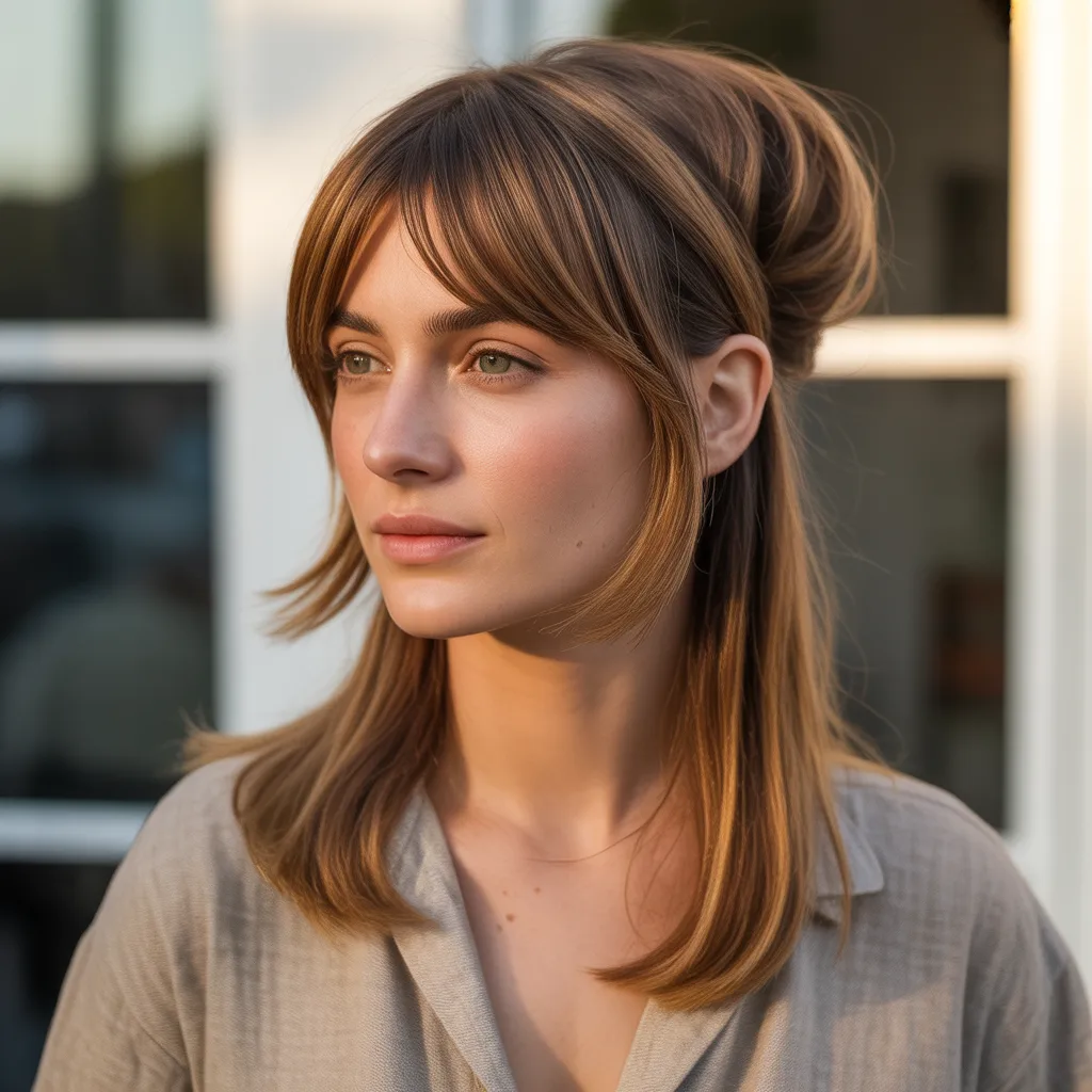 This version uses soft, subtle layers to avoid thinning out fine hair. Curtain bangs add fullness around the face without bulk.
