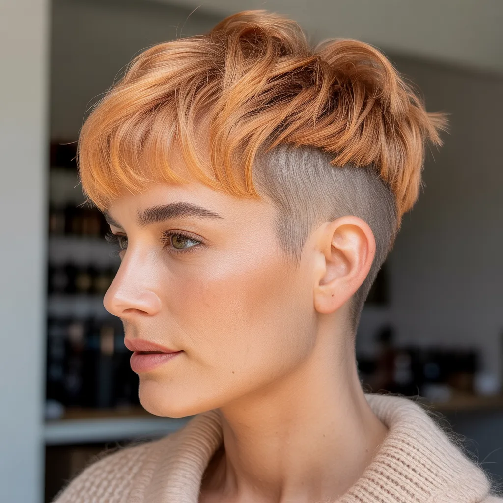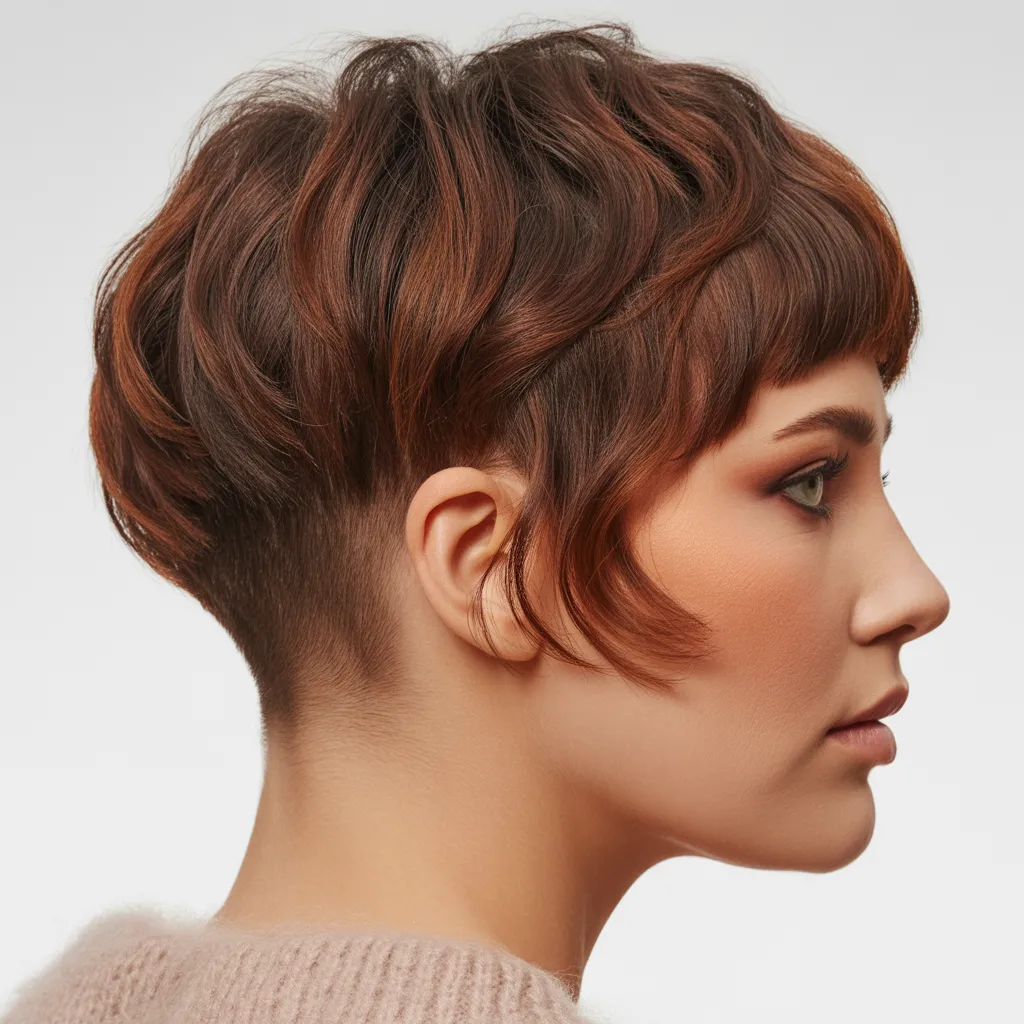 A pixie undercut provides a close-shaved section for contrast. The bangs on top are left longer to sweep across the head.