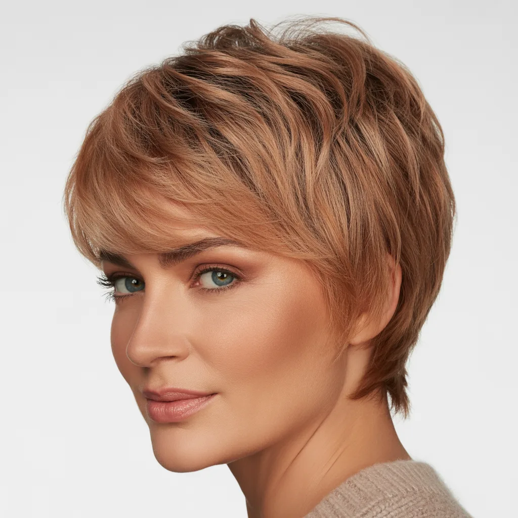 A short pixie cut combines with shag layers for a bold statement. The side-swept bangs offer a versatile way to change your look.