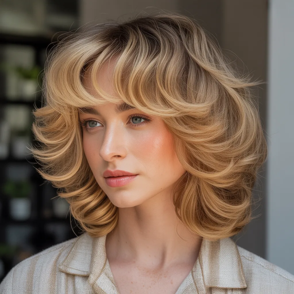 This cut uses internal layers to build significant volume on top. The feathered bangs are light and blend into the volume.