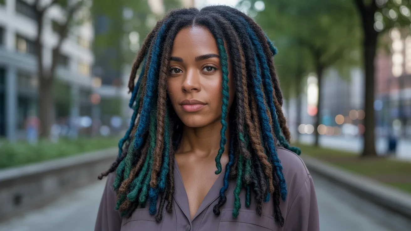 Cool-toned colors like deep navy, teal, forest green, and bright turquoise create a striking contrast when applied to darker loc bases. These shades feel bold and creative while still maintaining a certain depth that keeps them from looking too costume-like or unrealistic. Blue and green dyed locs are often chosen by people who want to express individuality through their hair in a way that feels artistic rather than casual.